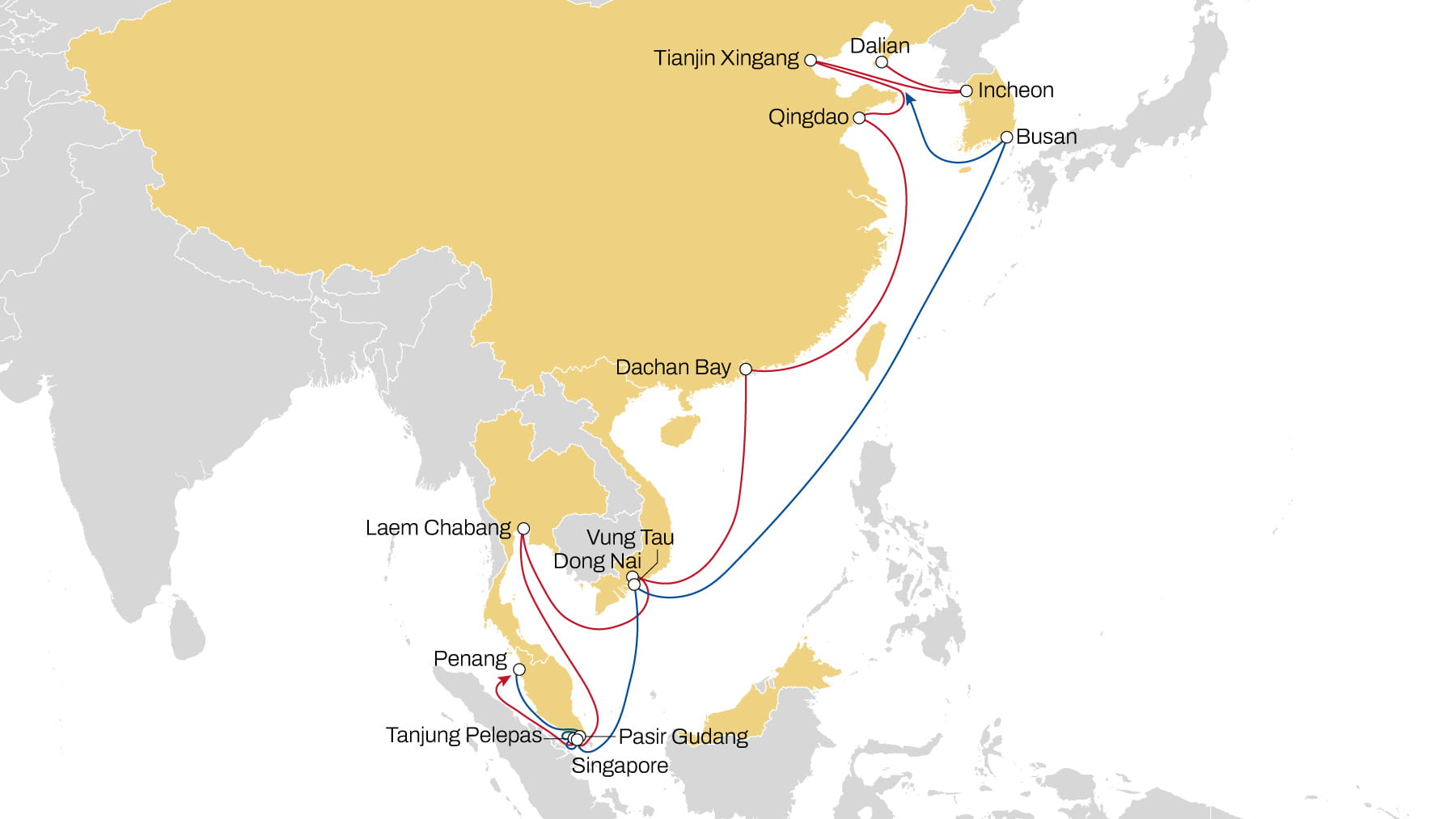 Dalian – Incheon – Tianjin Xingang – Qingdao – Da Chan Bay – Dong Nai – Laem Chabang – Singapore – Penang – Pasir Gudang – Singapore – Tanjung Pelepas – Busan – Dalian