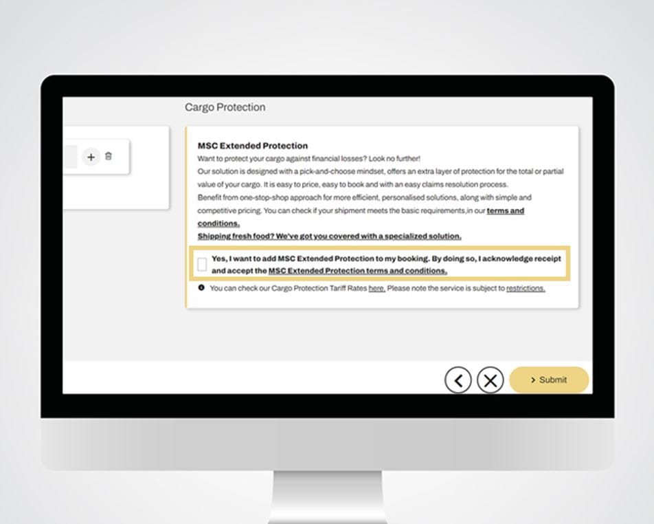 The tariff charged for MSC Extended Protection is easily calculated, based on your cargo value and specificities. There is also the option to select partial value protection. The applicable tariff will be displayed on your freight invoice to help ensure you receive the protection your cargo deserves.