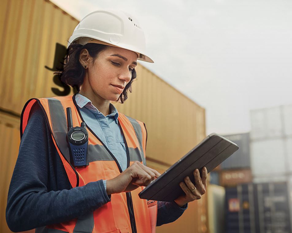 Person in business attire holding a digital model of an MSC smart container on a tablet.