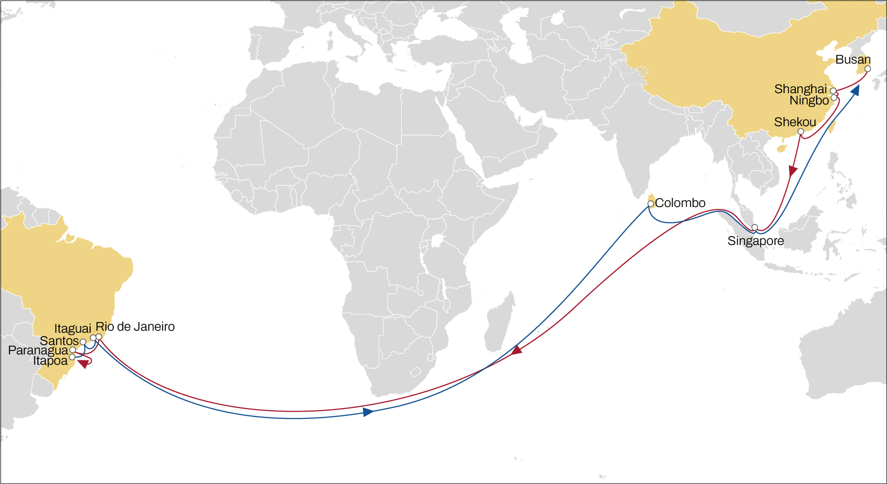 The full rotation is as follows: Busan – Shanghai – Ningbo – Shekou – Singapore – Rio de Janeiro – Paranagua – Itapoa – Santos – Itaguai – Colombo – Singapore – Busan