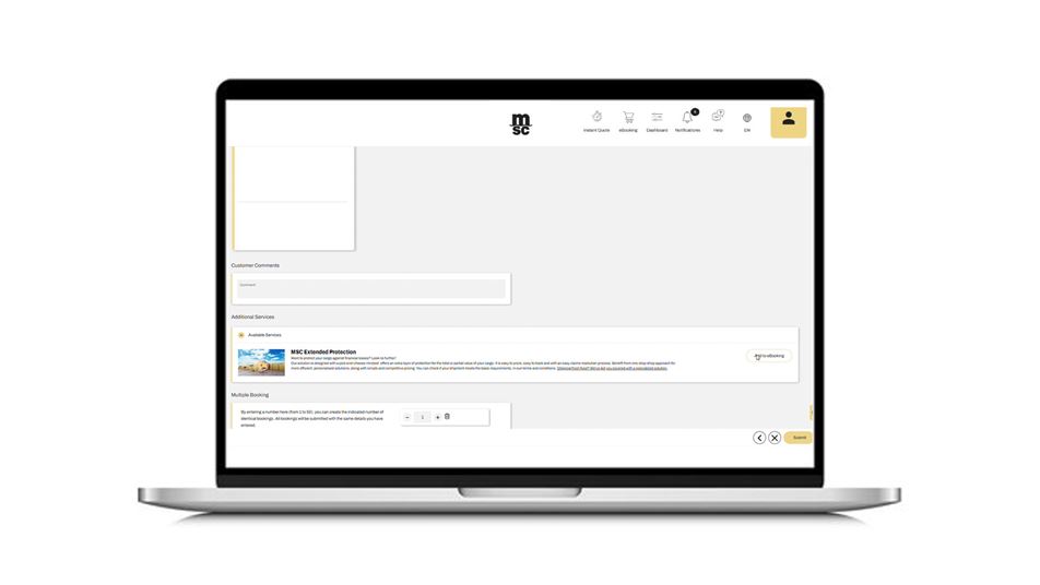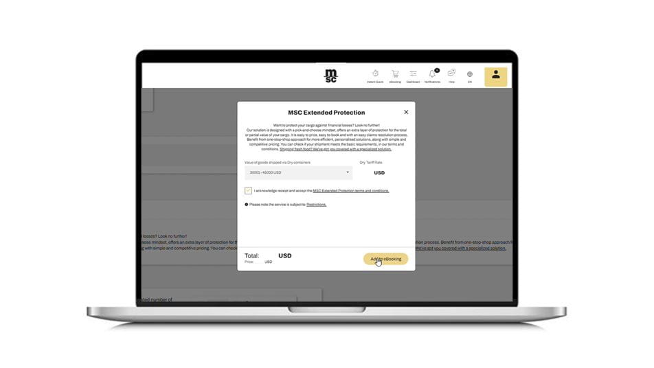 At the summary stage of your eBooking, you can find the option to include MSC Extended Protection in the additional services section. Simply click on "Add to eBooking" to start configuring the solution to your needs.