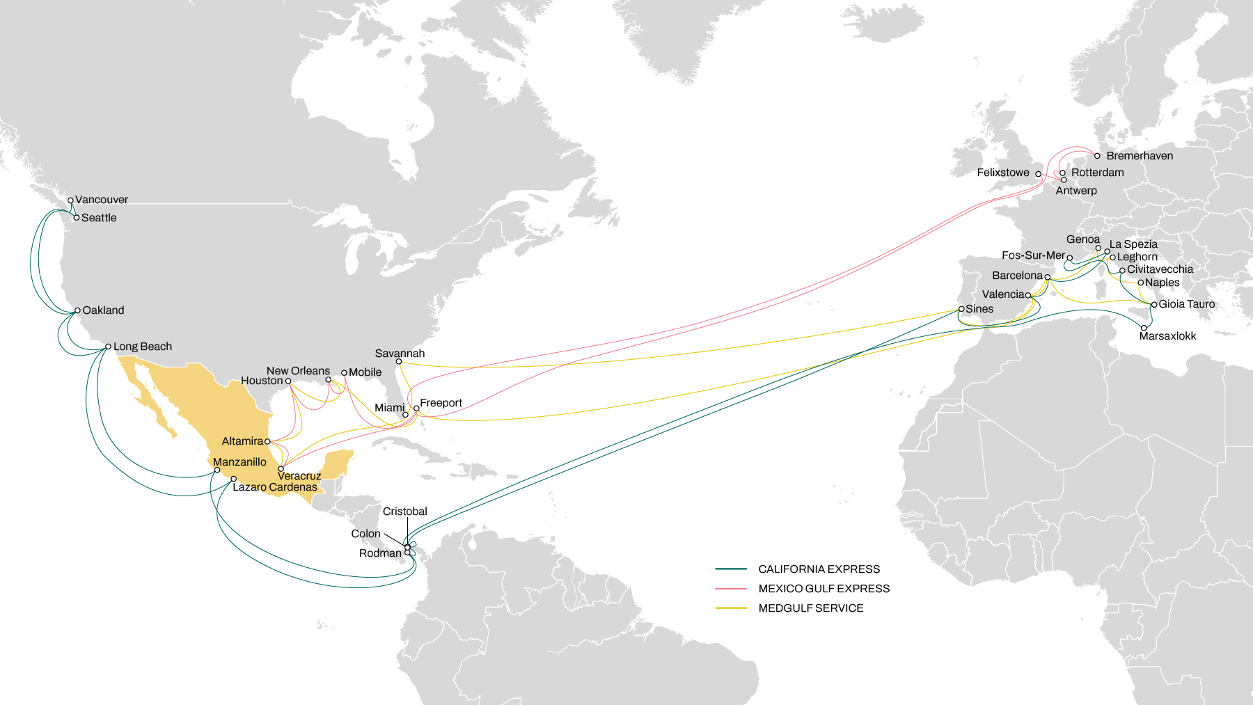 - Weekly departures from South of Italy (Napoli and Gioia Tauro) to Mexico East coast