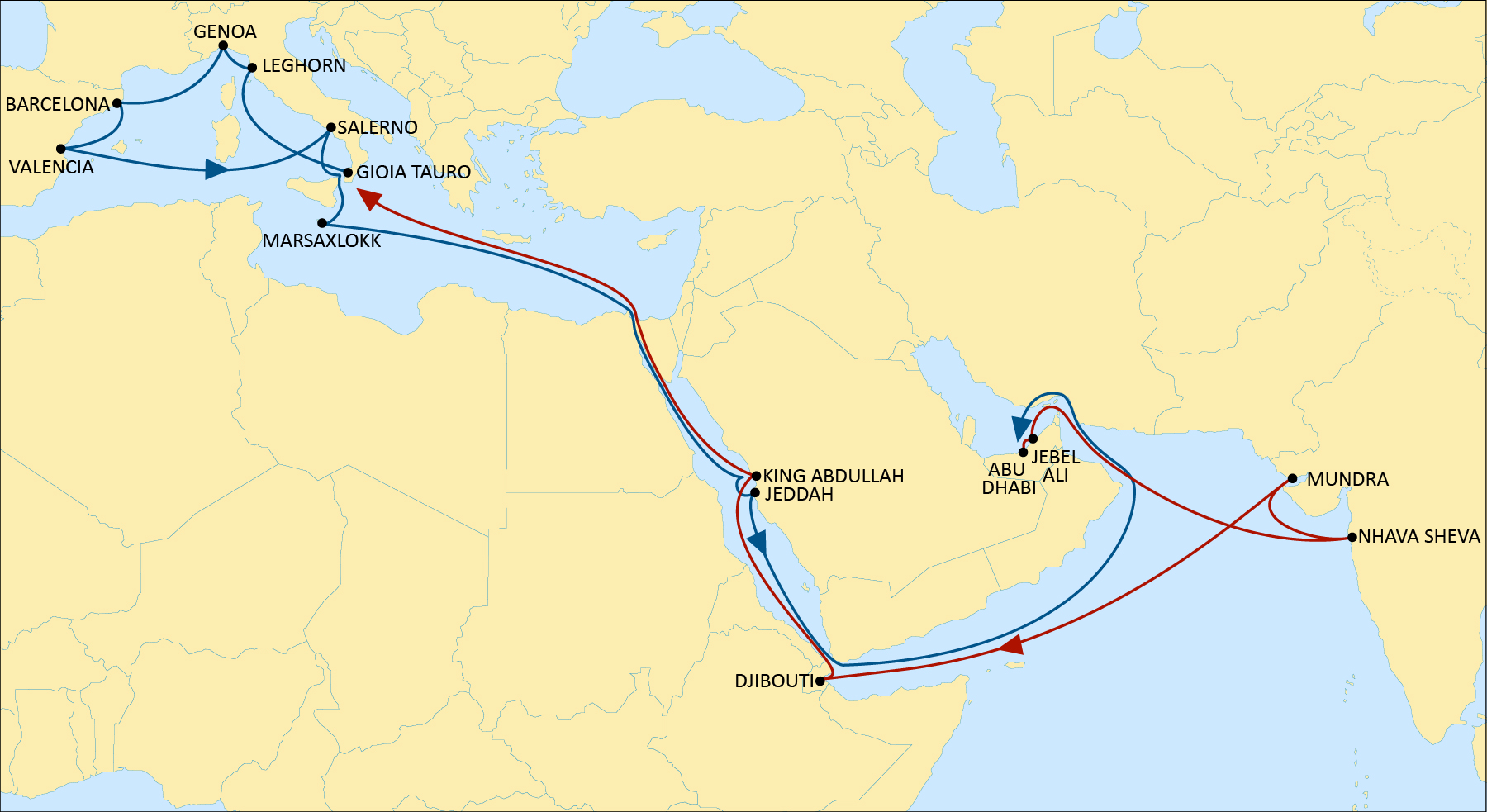 Abu Dhabi – Jebel Ali – Nhava Sheva – Mundra – Djibouti – King Abdullah Port – Gioia Tauro – Leghorn – Genoa – Barcelona – Valencia – Salerno – Gioia Tauro – Marsaxlokk – King Abdullah Port – Jeddah – Abu Dhabi