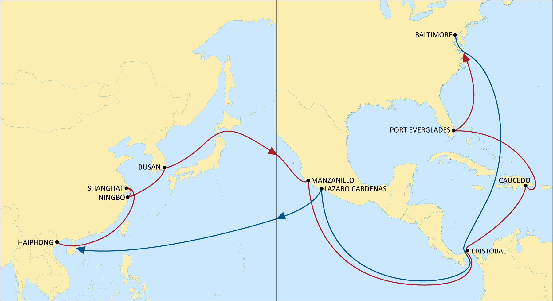 Haiphong – Shanghai – Ningbo – Busan – Manzanillo – Cristobal – Caucedo – Port Everglades – Baltimore