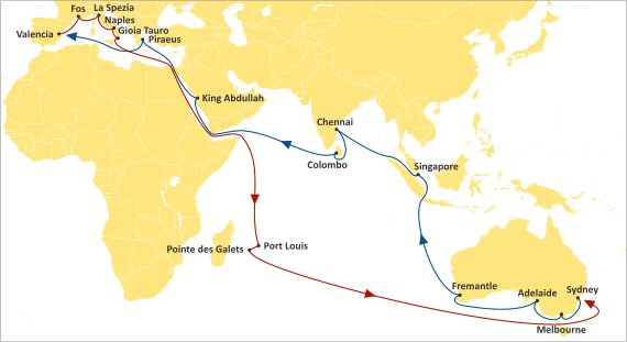 Port rotation: Sydney, Melbourne, Adelaide, Fremantle, Singapore, Chennai, Colombo, King Abdullah Port (Saudi Arabia), Piraeus, Valencia, Fos, La Spezia, Naples, Gioia Tauro, Port Louis, Pointe des Galets, Sydney.