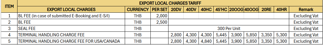 Effective 18 November 2025, OTHC for reefer containers will be updated to THB 3,350 per 20RE and THB 5,300 per 40HR. Rates exclude VAT.