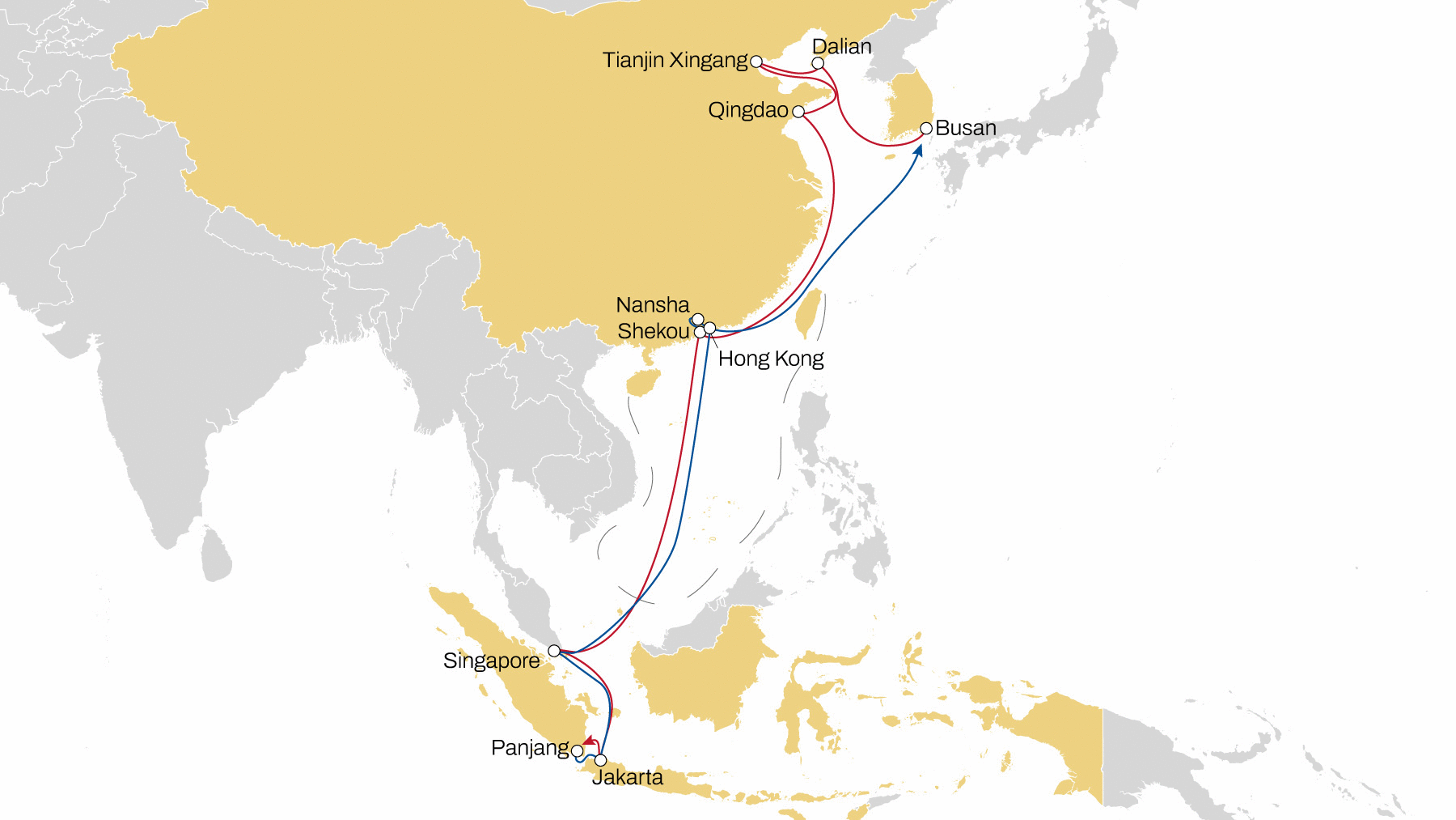 Busan – Dalian – Tianjin Xingang – Qingdao – Shekou – Singapore – Jakarta – Panjang – Jakarta – Singapore – Hong Kong – Nansha – Busan