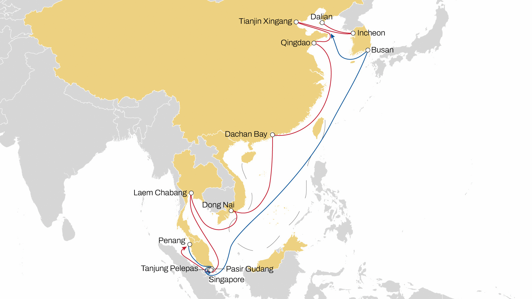 Dalian – Incheon – Tianjin Xingang – Qingdao – Da Chan Bay – Dong Nai – Laem Chabang – Singapore – Penang – Pasir Gudang – Singapore – Tanjung Pelepas – Busan – Dalian